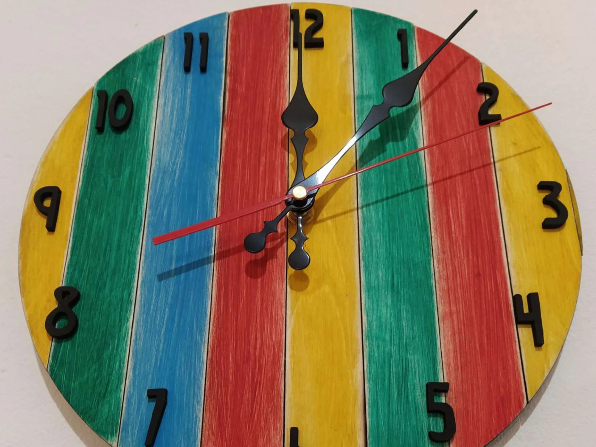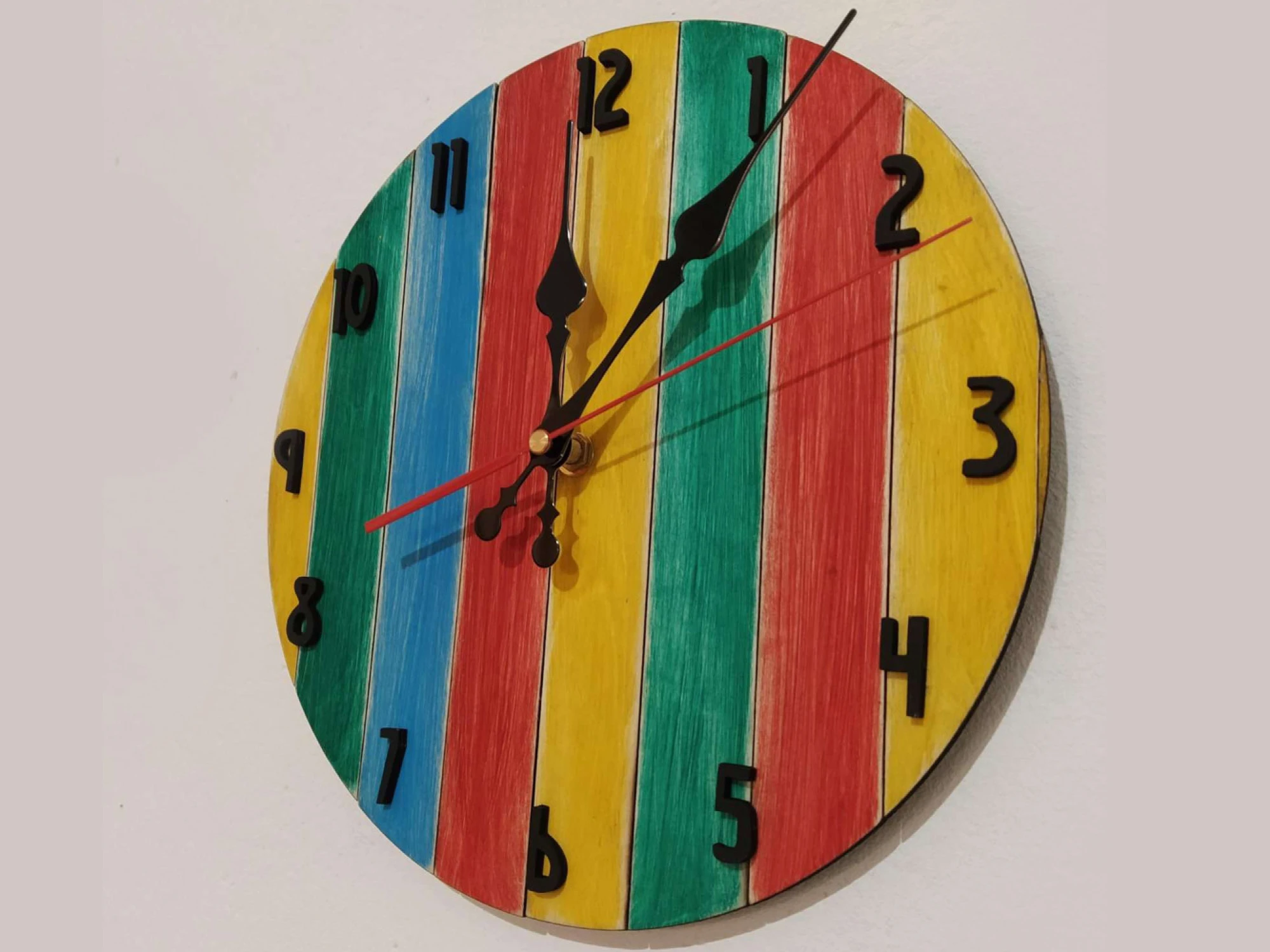 Часовникът е изработен от слепени дървени летвички, обработен с различни цветове. Цифрите са от отделно изрязано дърво и слепени към основата. Механизмът е безшумен, работи с 1 батерия АА, която не е включена в цената.