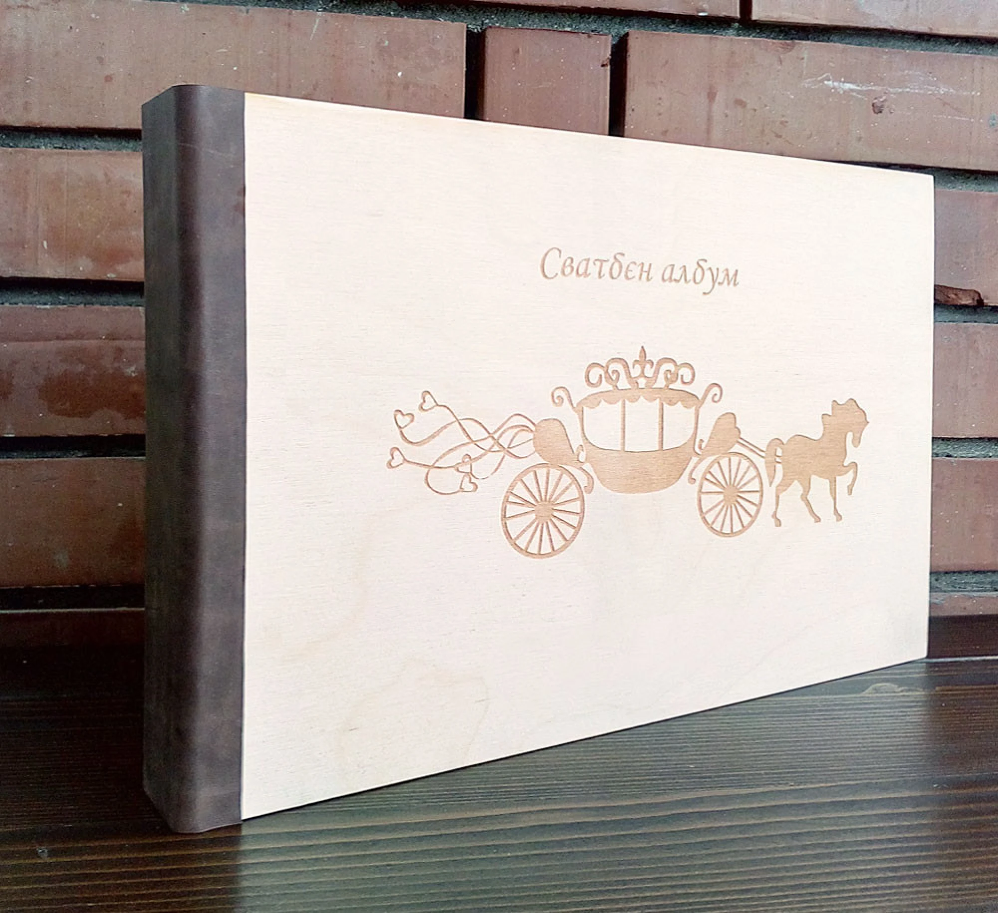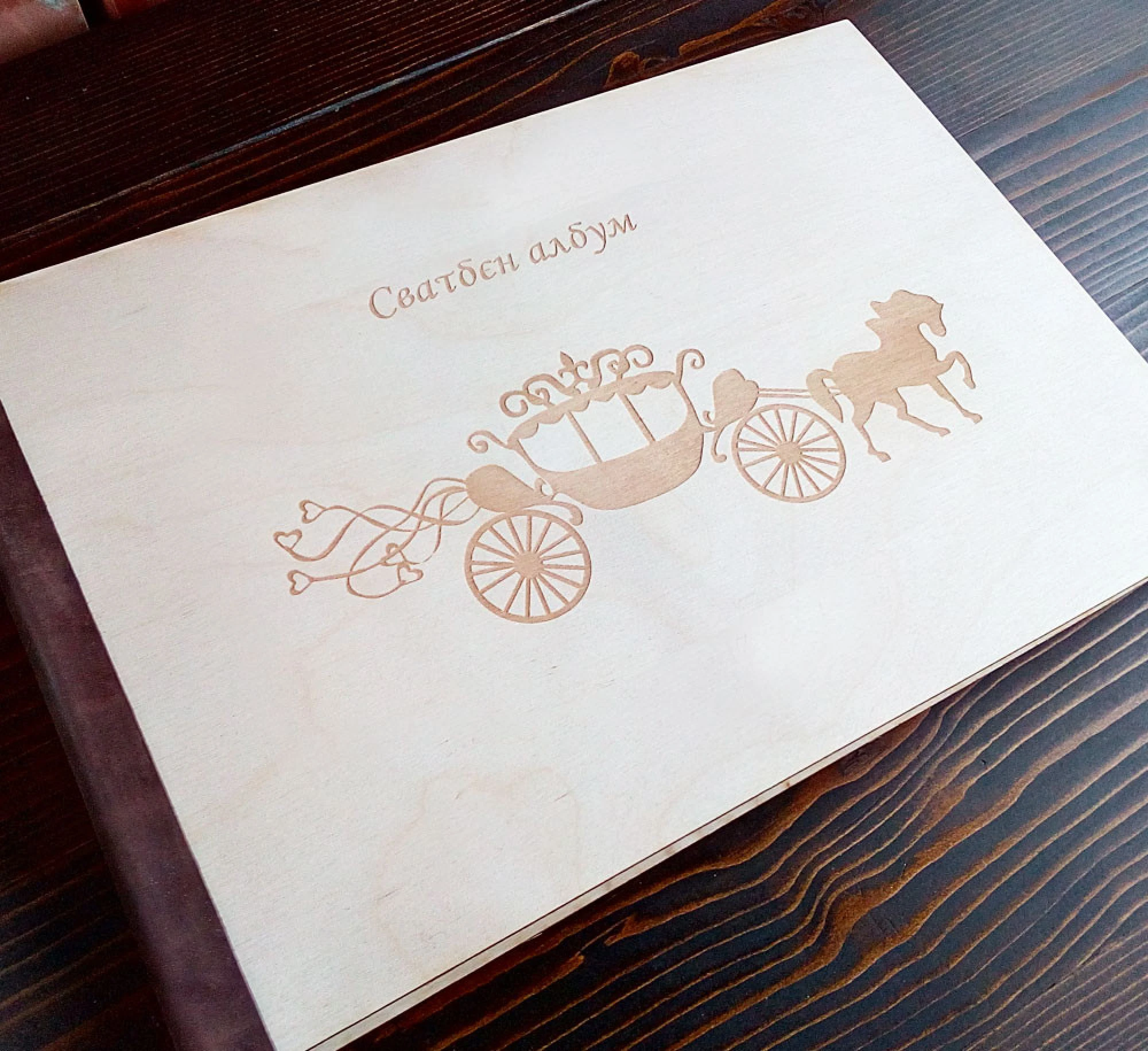 Луксозен албум за снимки с лазерно гравирани, дървени корици - ръчна изработка. Подходящ за сватба, но с възможност за гравиране на различни послания.