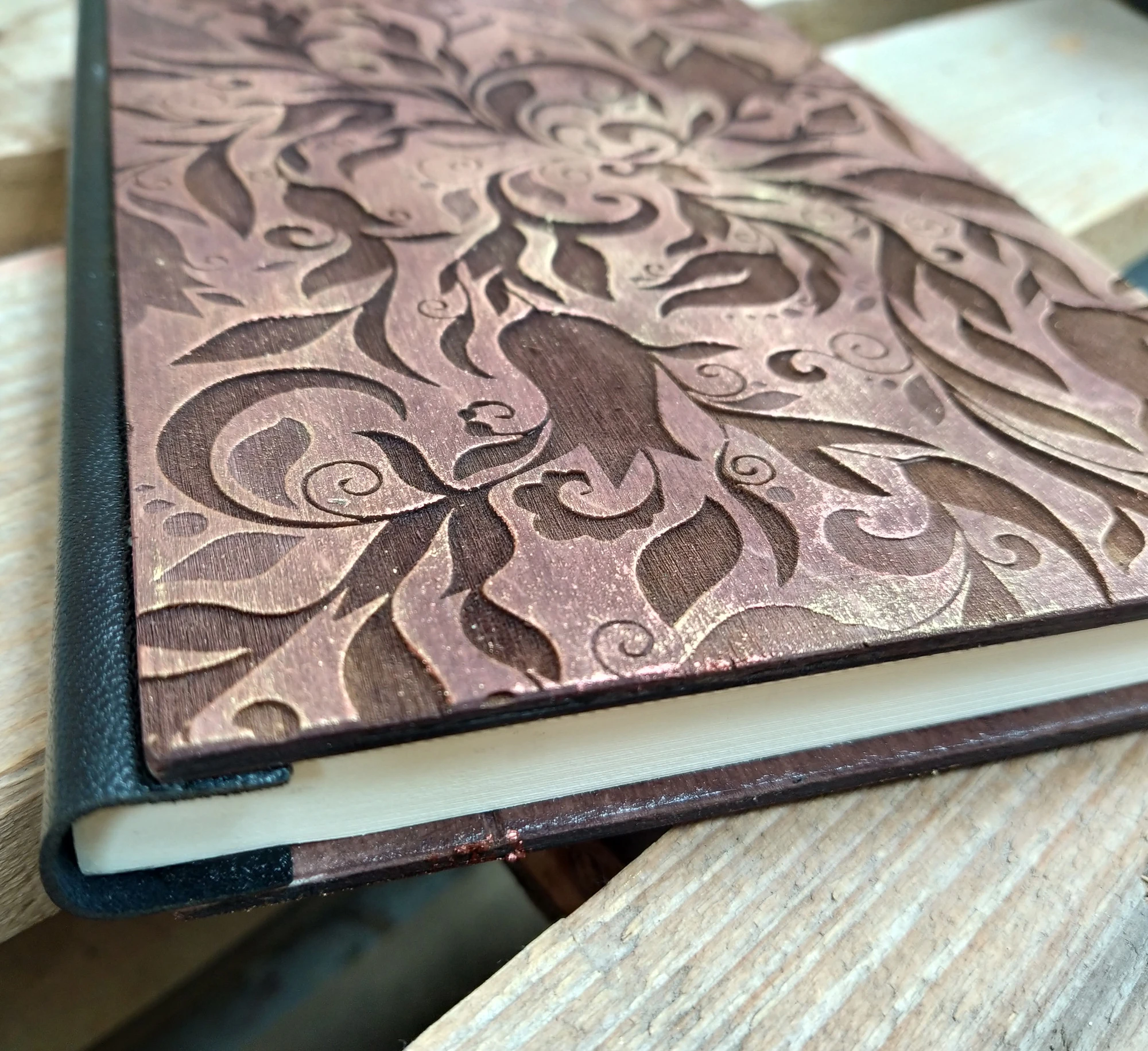 Тефтерът е изработен от 4мм дървени корици, свързани с кожа.