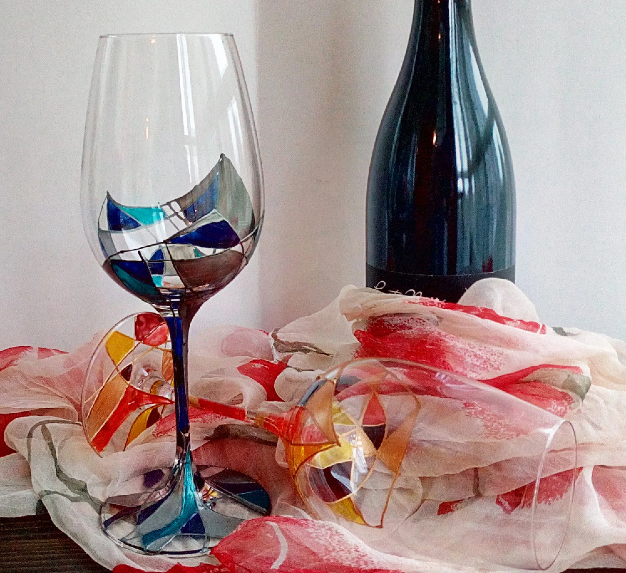 Ръчно рисувани чаши за вино - Синьо и бяло
